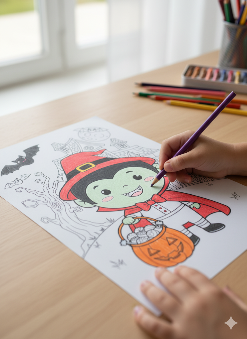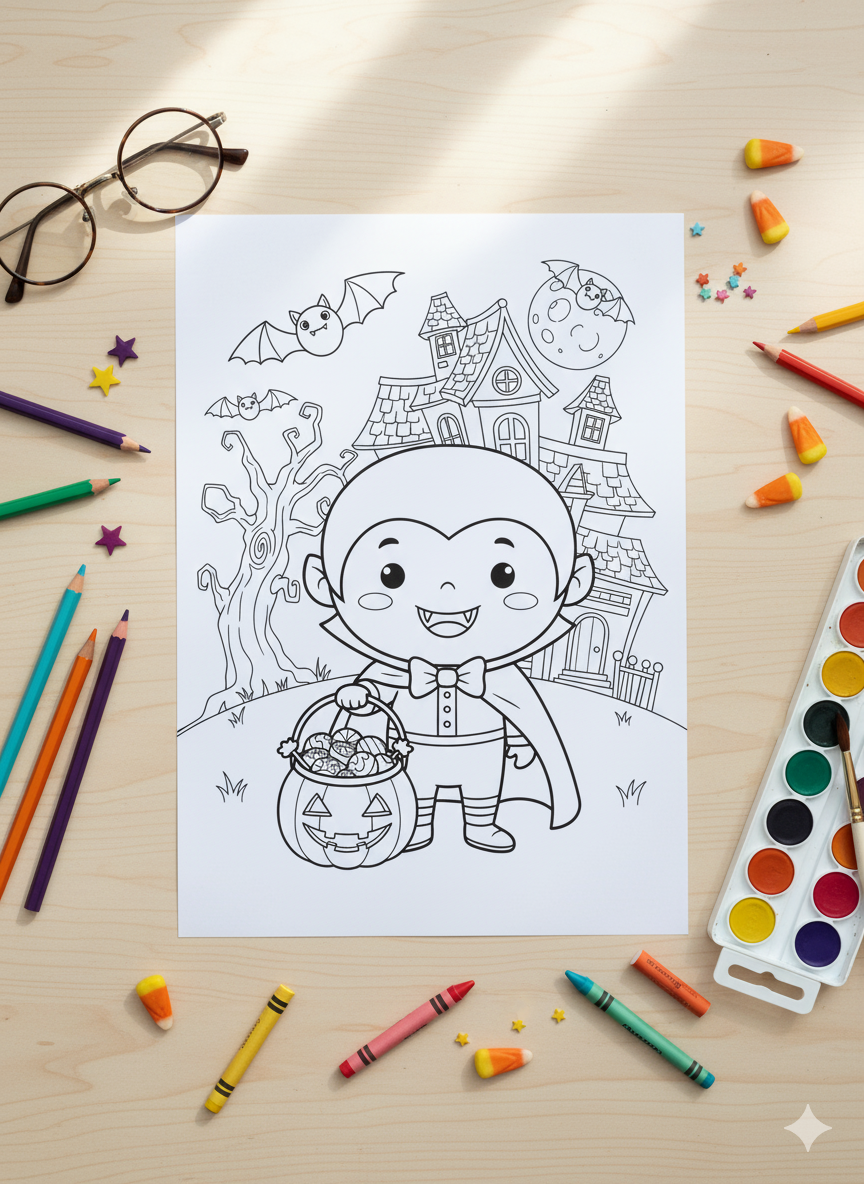 Join the cutest little vampire on his favorite night of the year with this fun Vampire Trick or Treat Halloween Coloring Page! This scene is packed with classic fun: a friendly Dracula with his pumpkin pail, a whimsical Haunted House Art background, and cute bats flying by the moon. It’s a delightful adventure waiting for your child's colorful touch as you prepare for the big night.